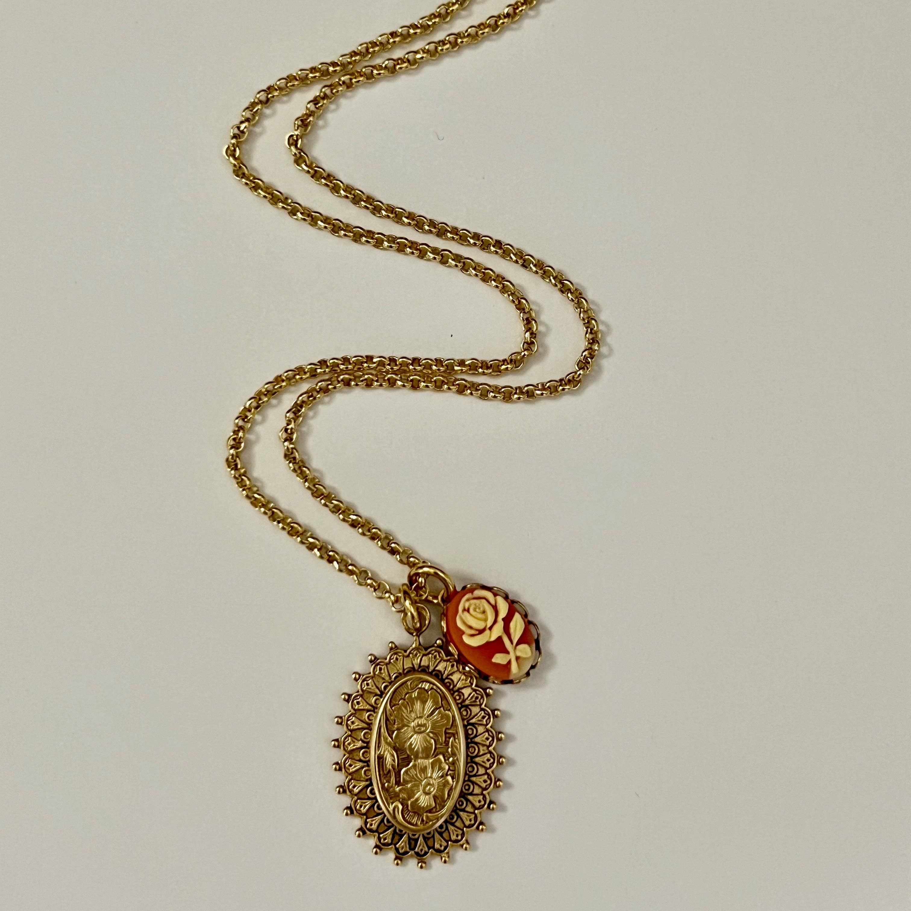 Indulge in the breathtaking beauty and details of this exquisite double medallion necklace.