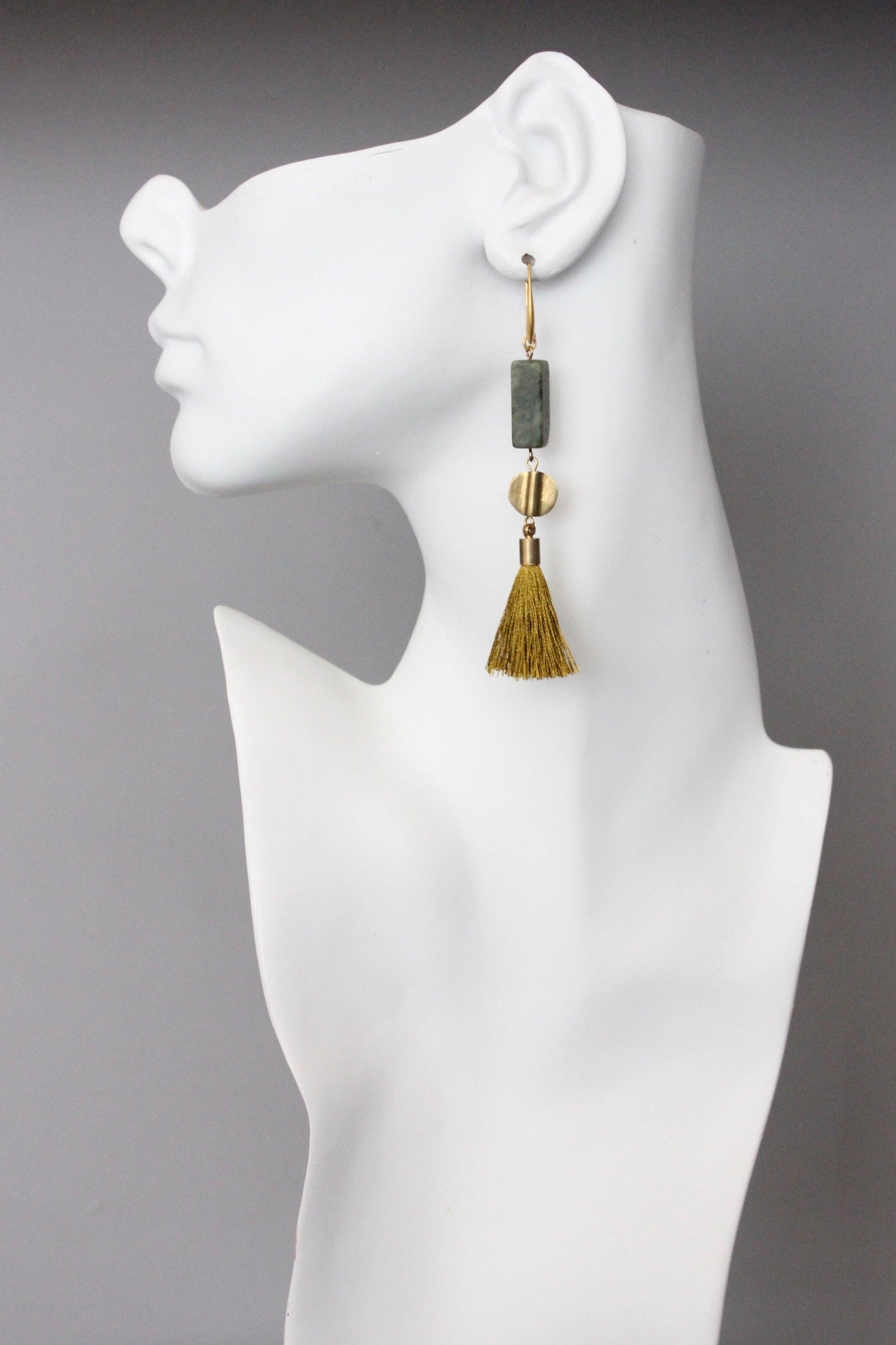 18k gold plated brass hook with jasper, brass, and silk mustard tassels
