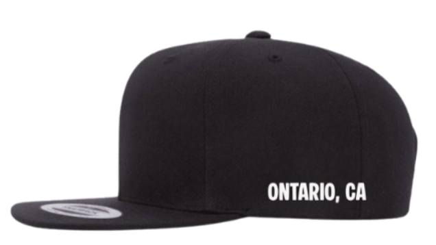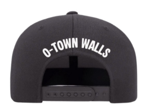 "DTO" is embroidered on front of hat with "O-TOWN WALLS" embroidered across the snap back arch and "Ontario, CA" embroidered on the right side of cap.