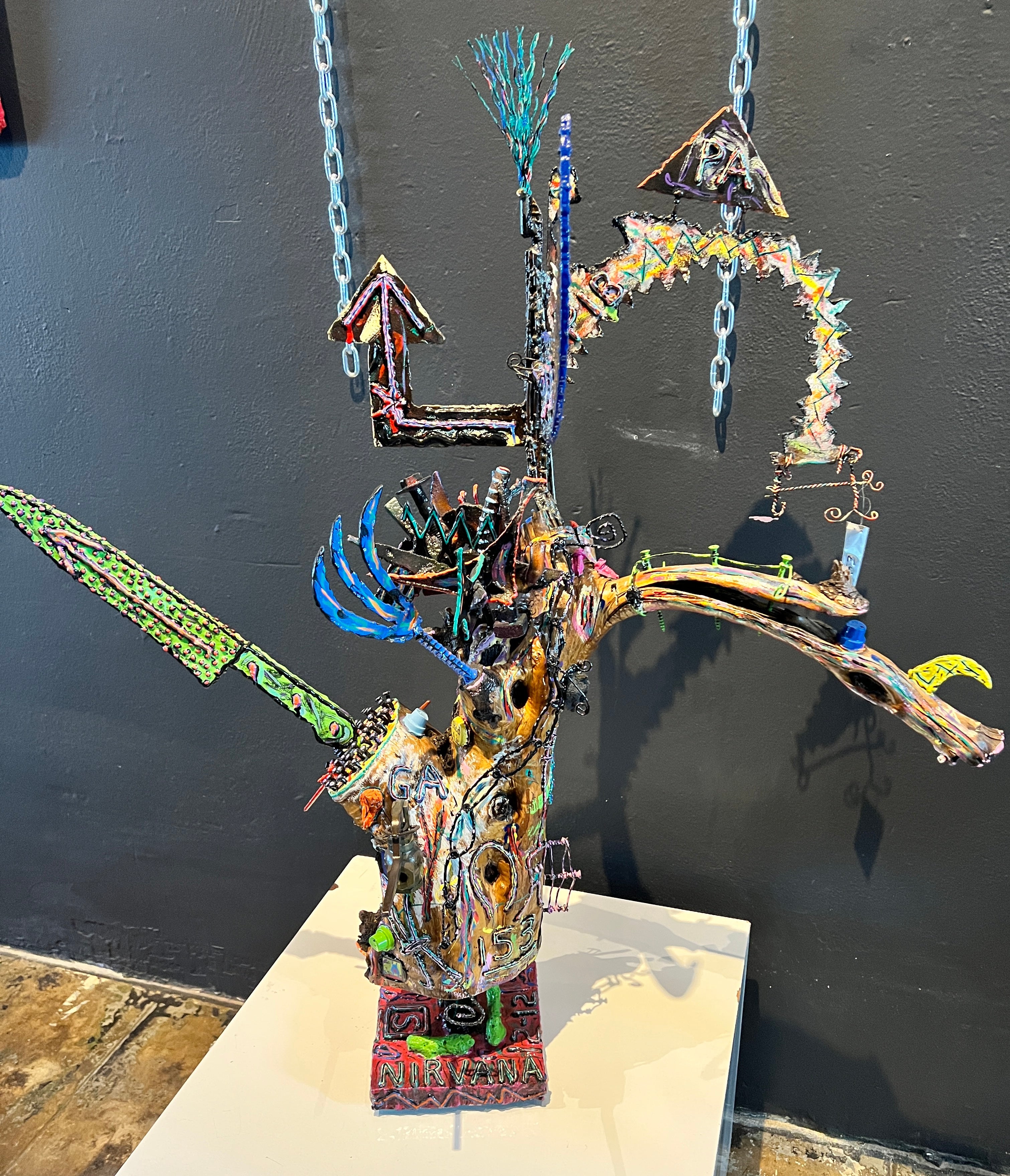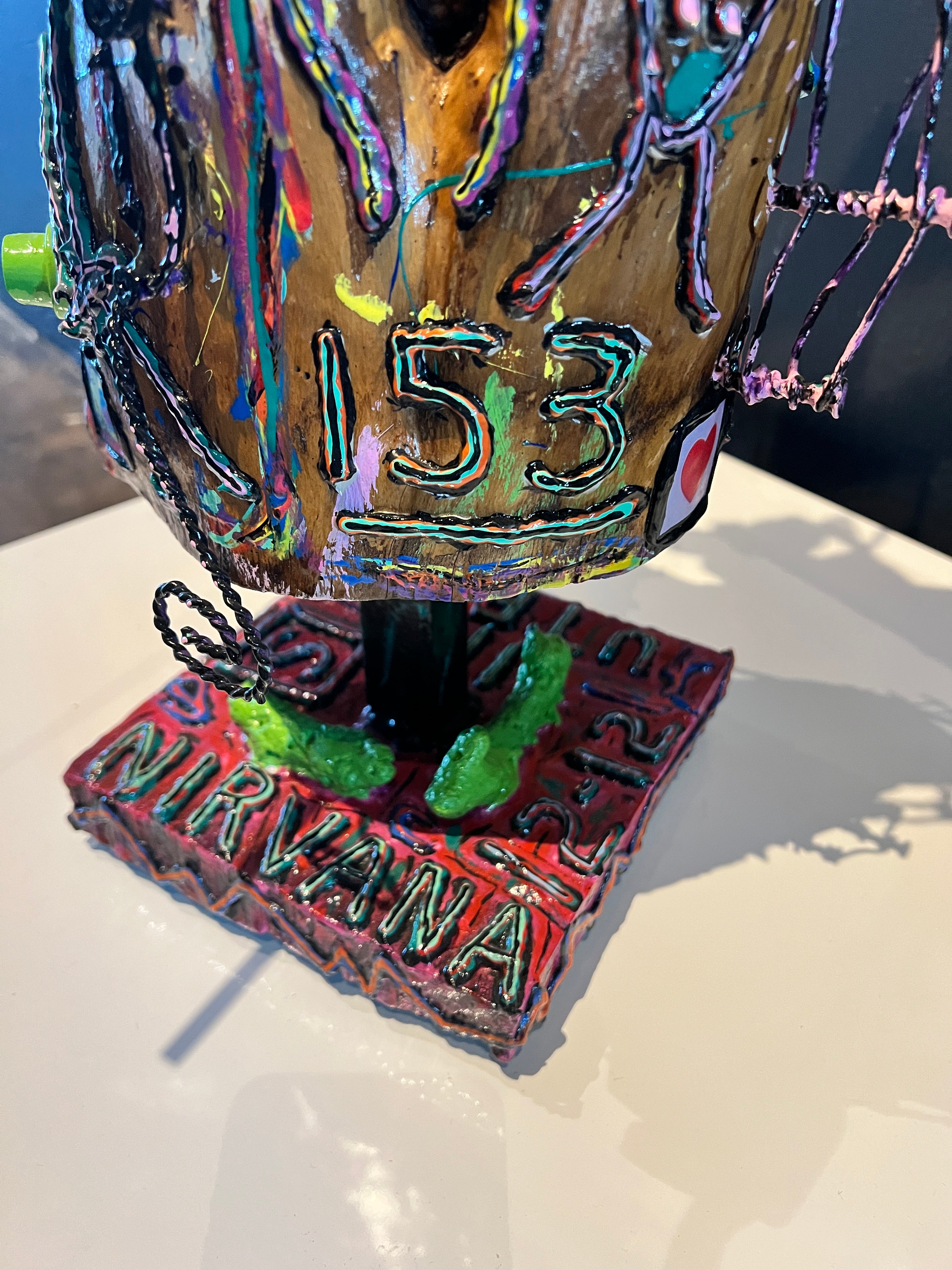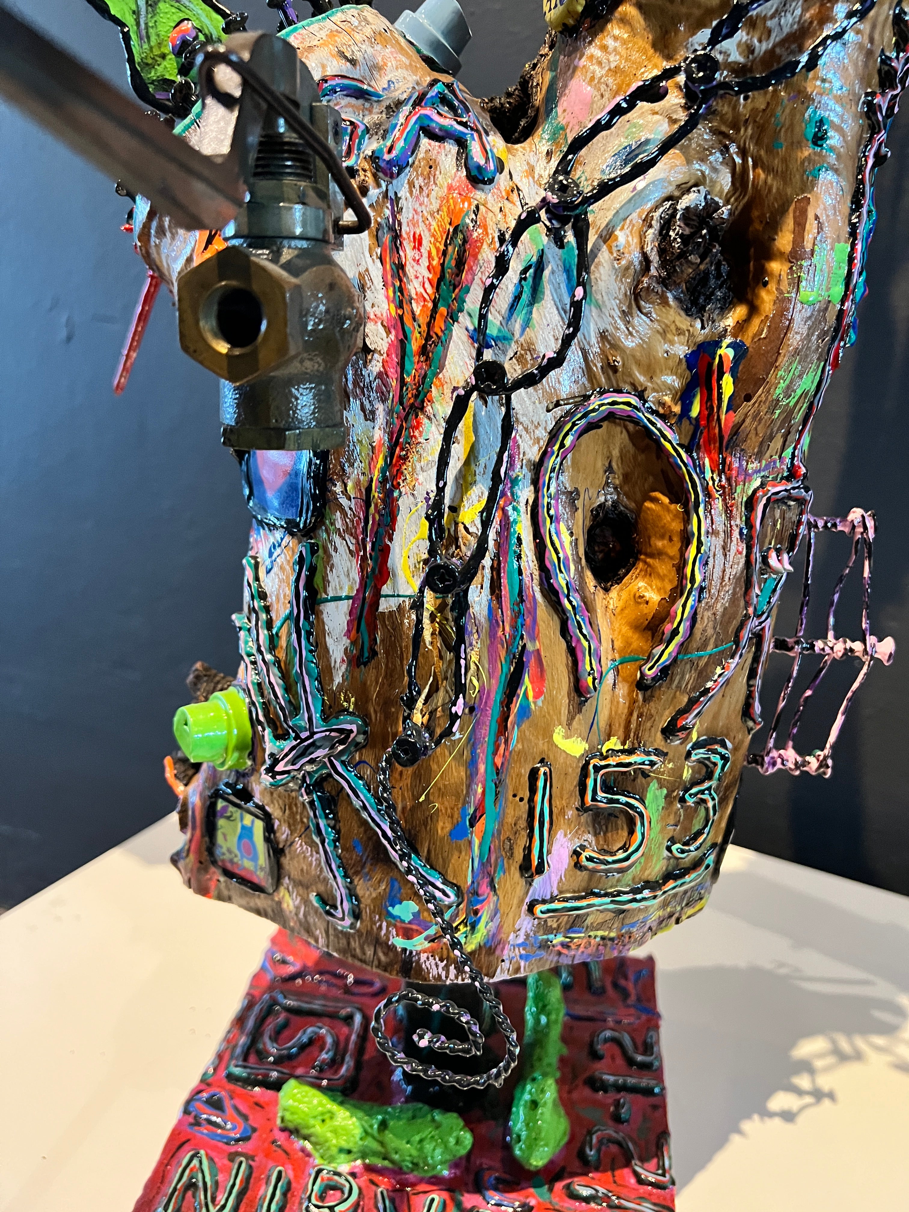 This was a difficult choice. My first instinct, given the complexity of this piece, was to recon it in a black monochrome surface, emphasizing its form and textural traits. Ultimately, I could not paint over the entire surface. There were too many attributes (knots, surface defects, the beauty of the natural wood, etc.) that I wanted to accentuate so I decided to reply on paint swatches, NTS, the Unusual Suspects including our Quail Chicks, a DTR, 2x dispenser caps and liquid Nails, etc.
