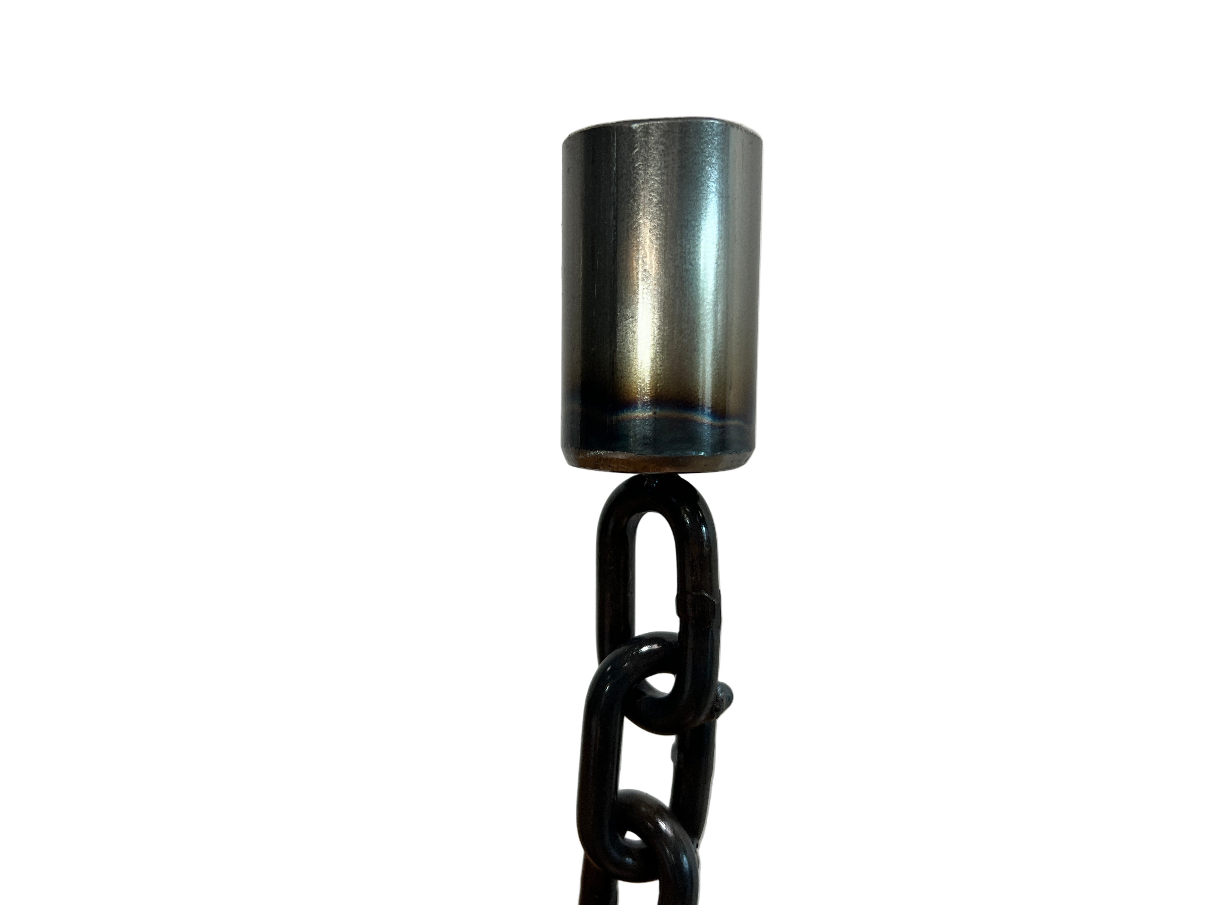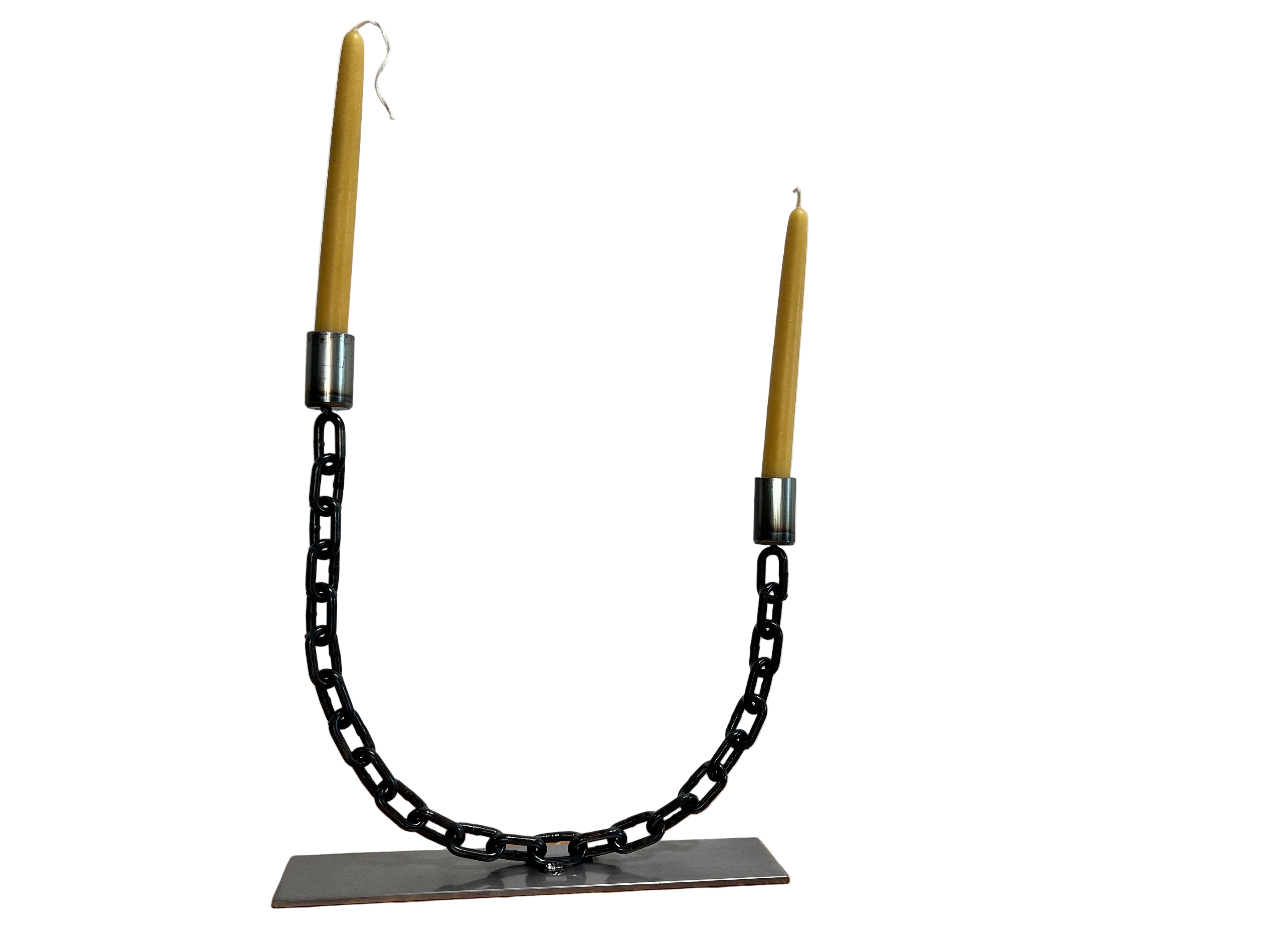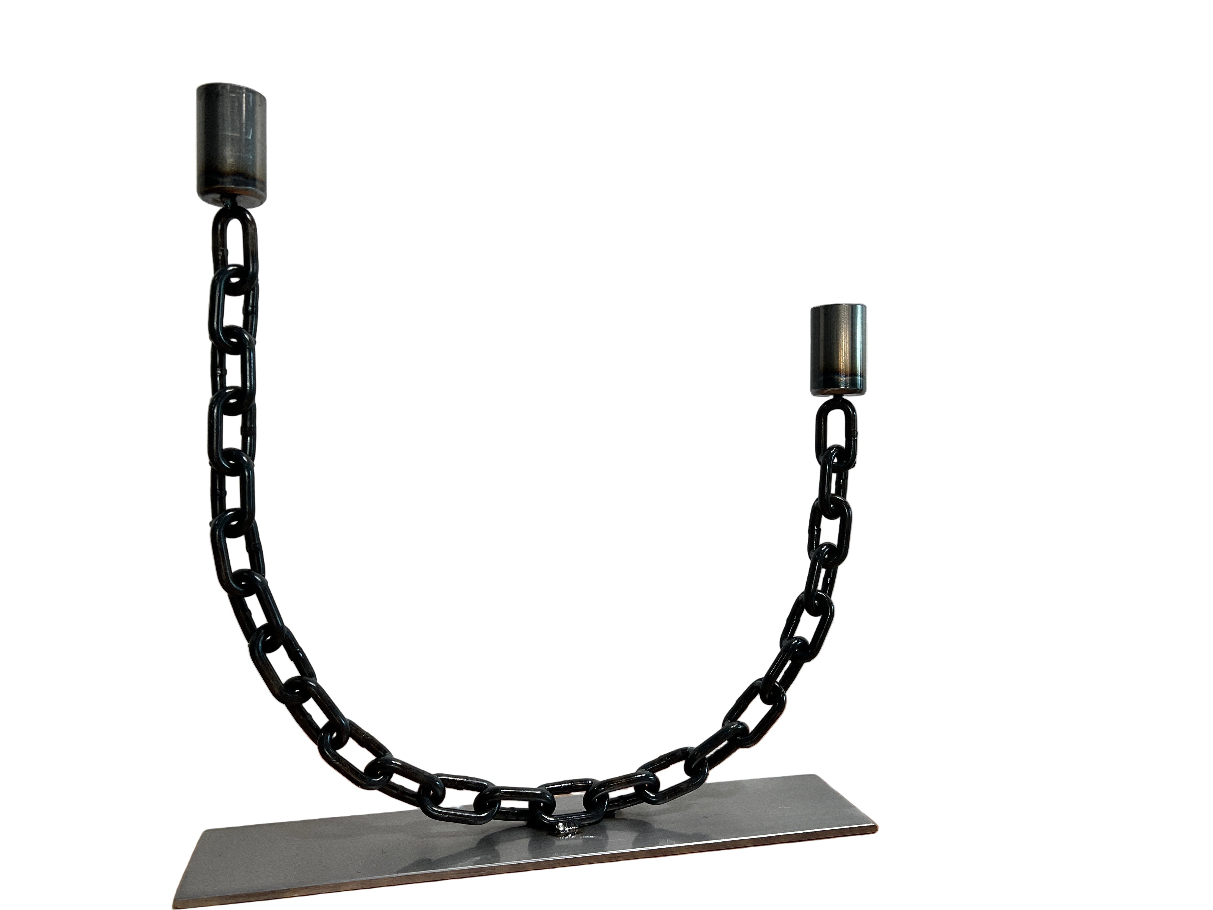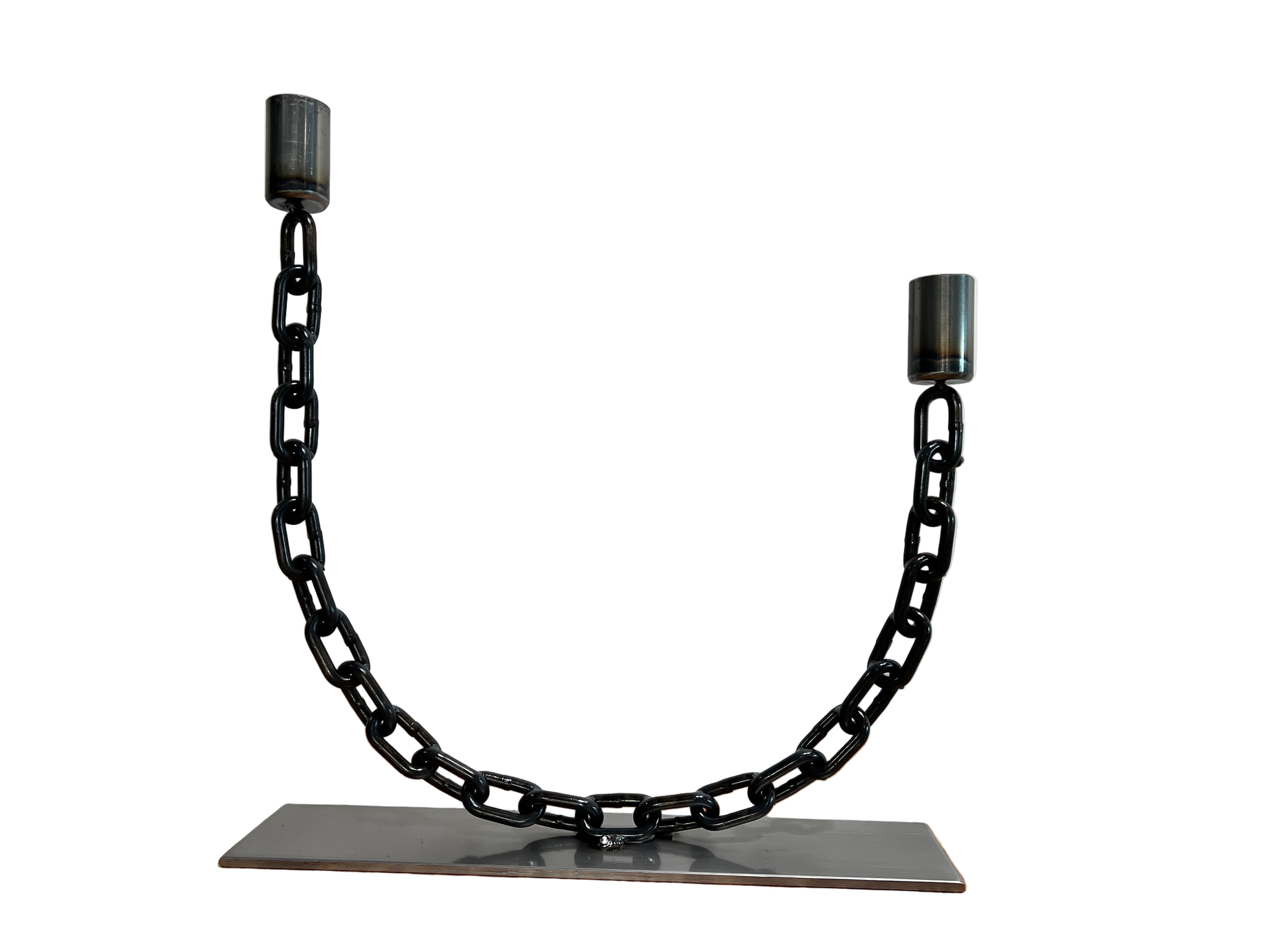 Add an edgy vibe to your space with this playful candelabra, handmade from sturdy steel and chain. Measuring 14"L x 3"W x 15"H (without candles), it's the perfect centerpiece to spark conversation and light up your room with style and a touch of cool.