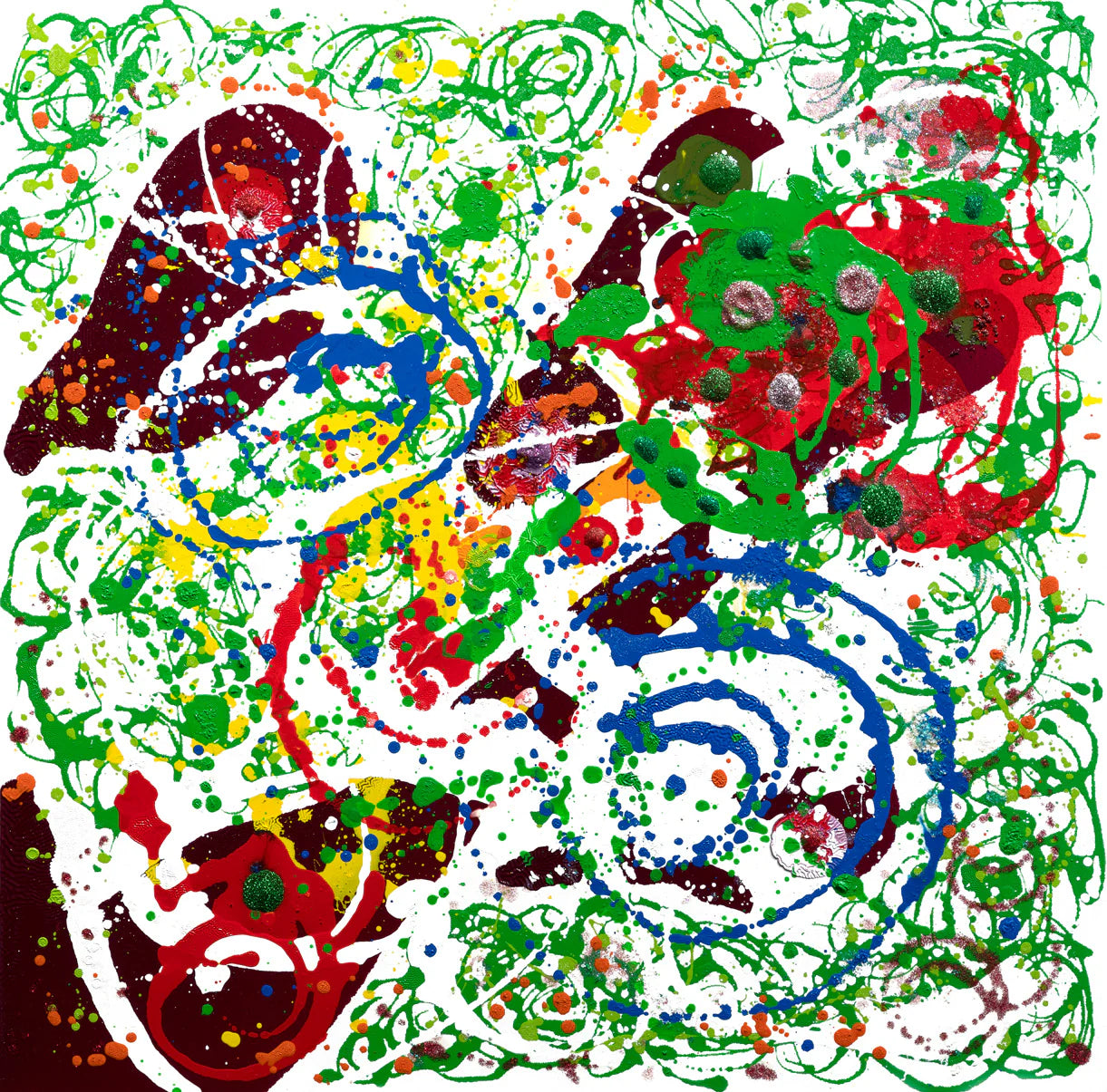 The bare canvas is to be explored through color, form and texture, depicting dynamically her inner subconsciousness.  Like a Rorschach ink blot on steroids, her energy paintings disregard representational line, form and predisposed symbols, spurring the viewer to experience the painting with no preconceived notions and create a personal meaning, which is tantamount to Ginger's creative process.