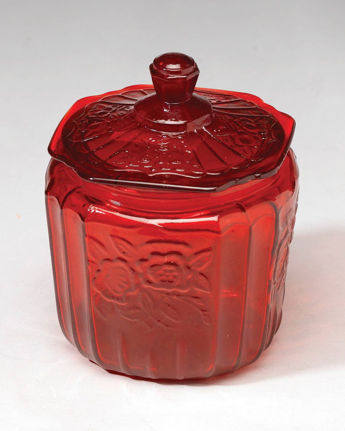 A ruby red glass jar with embossed floral detail and matching lid, designed for use as a storage or display piece within decorative glass collections.