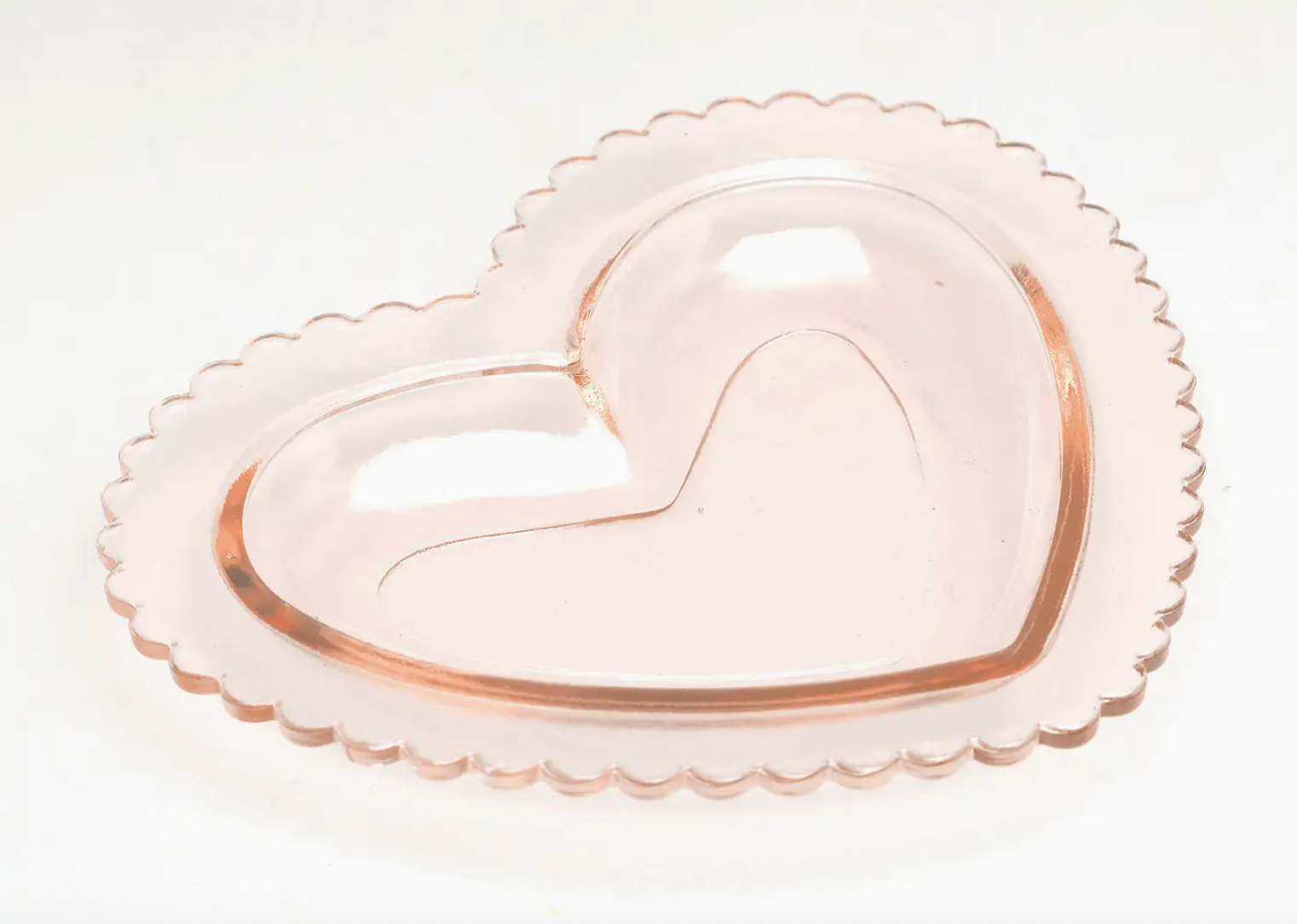 A glass heart dish available in either Red or Pink with scalloped edging, ideal for use as a trinket holder, candy dish, or decorative tabletop accent.